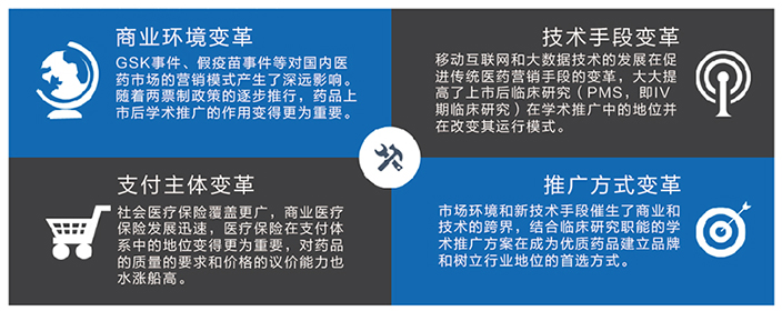 契合国家医疗卫生体制改革方向,合法、合规、高效、多方共赢的以大数据为核心的医药营销平台,传统的营销模式如多级代理商、与医生人情往来等方式的空间越来越小,带给企业的风险也越来越大,符合监管要求以及企业、医生、病人多方面利益的规范的操作模式是通过专业学术推广驱动医药产品销售。